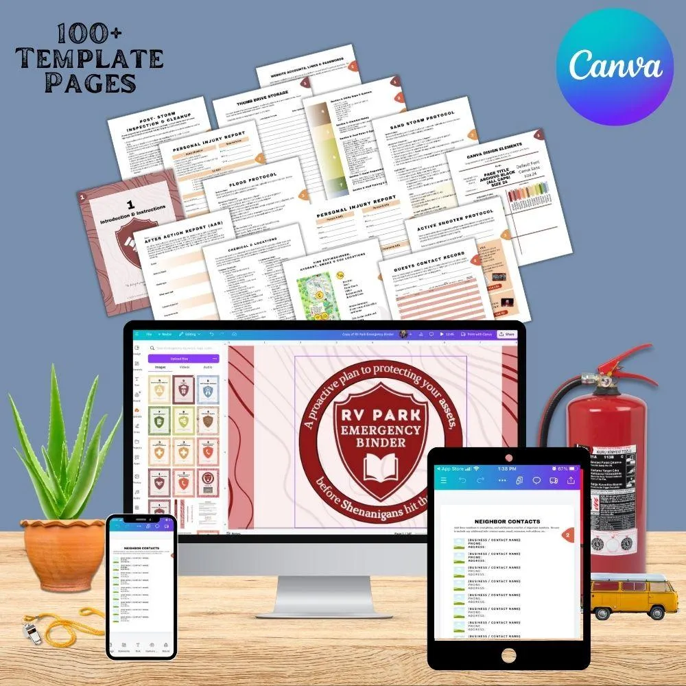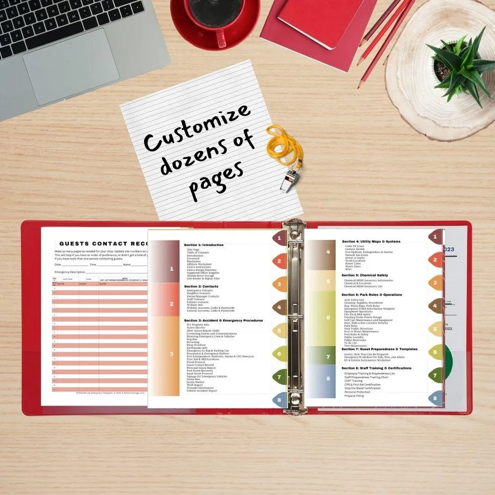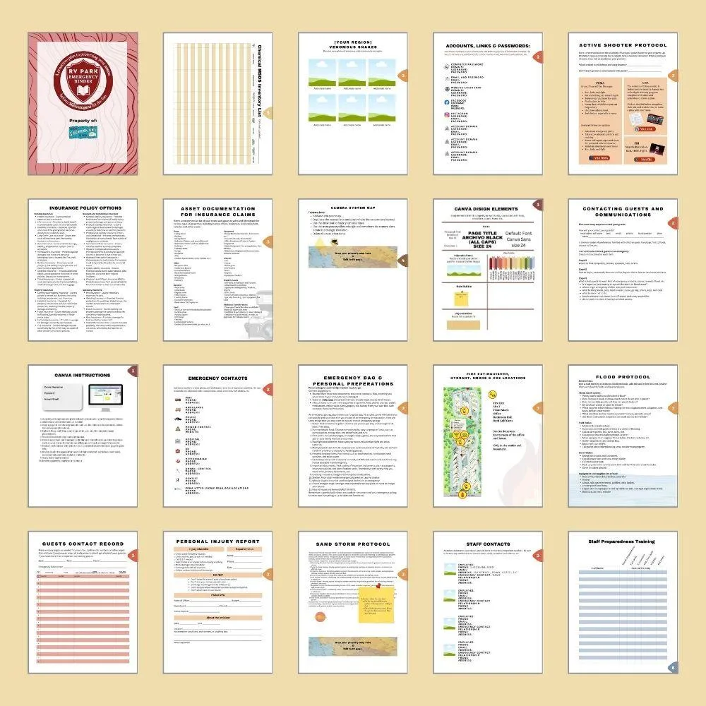 Save months of time with our customizable RV Park Emergency Binder. It includes ready-to-use templates for nearly every emergency scenario, so you can skip building from scratch and focus on running your park confidently, knowing your plan is set.